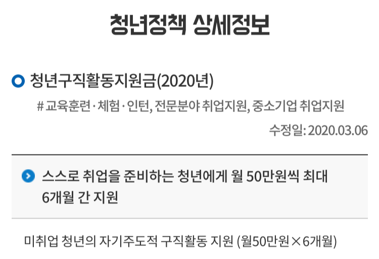 청년구직활동지원금은 취업을 준비하는 청년에게 매월 50만원씩 최대 6개월간 지원하는 정책입니다. 실업급여의 경우 직장에 다니다 그만두게 될경우 지원을 받는 정책이라면 구직활동지원금은 아직 취업을 하지 못한 분들을 지원하기 위하여 스타트를 돕는 그런 정책이라고 생각하시면 될듯하네요.