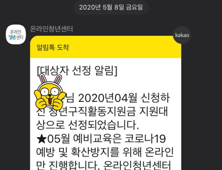 신청서 작성이 완료된경우 다음달 매월 8일 발표일자에 위와같이 청년구직활동지원금 지원대상자로 선정되었다면 문자나 카카오톡으로 온라인청년센터에서 연락이 옵니다.