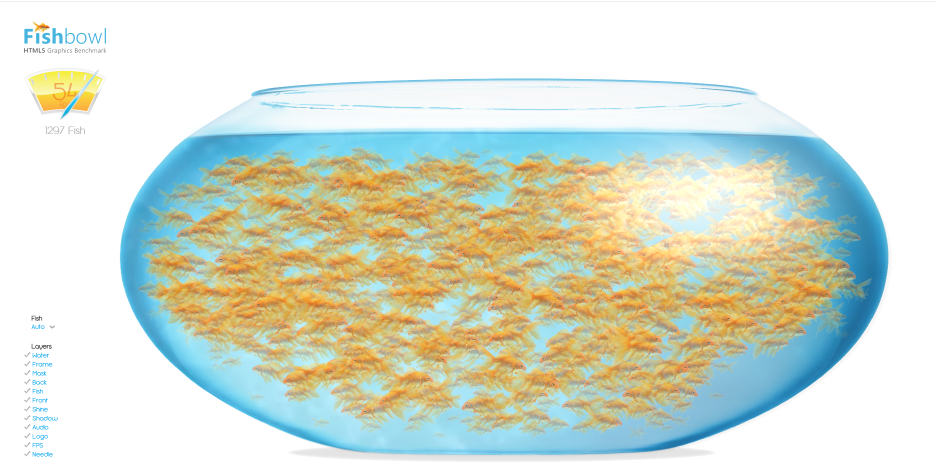 위링크를 통해 fishbowl 페이지에 들어가셨다면 오른쪽 상단에 있는 게이지가 확인되실꺼에요. 사진상 윗쪽의 60fps는 프레임을 나타내고 밑의 10 Fish는 현재 어항에 들어있는 물고기가 나타나면 이 물고기 숫자가 많으면 많을수록 내기기의성능이 그만큼의 성능을 가진다는걸 의미한다고합니다.