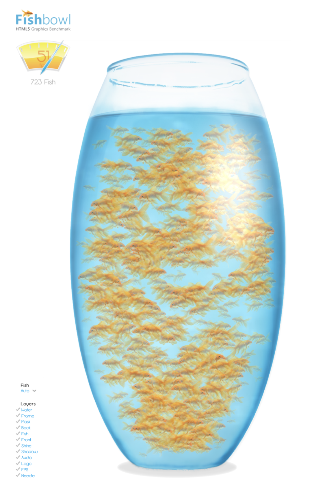 Thanks for checking out this Internet Explorer 9 Platform Preview demo. This demo uses animation techniques to display fish animating around a Fish Bowl. The faster your underlying browser and computer, the more Fish will appear on the screen. Fish Layers