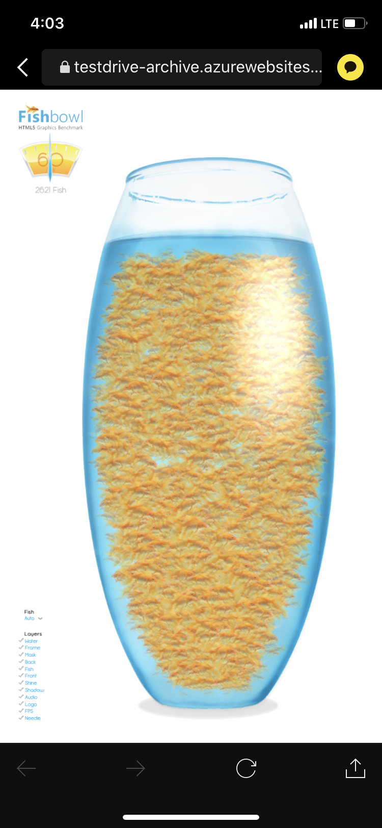 위 링크가 바로 물고기 테스트 / 금붕어 테스트로 유행중인 Fishbowl을 할수있는 링크인데요. 위사이트를 들어감으로 써 나타나는 페이지에서 본인이 휴대한 스마트폰이나 노트북을 활용하여 간단하게 웹브라우저의 그래픽 카드 가속 성능 벤치마크를 통해 나의 전자기기의 성능을 테스트해볼수있습니다!