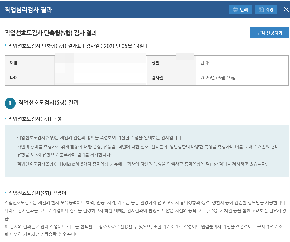 직업선호도검사를 완료하셨으면 [ 검사결과보기 ] 페이지에서 위와 같인 검사결과를 확인할수 있습니다. 센터에서 제출하라는 양식대로 캡쳐본을 내라고 한다면 해당 페이지를 캡쳐하여 제출하시고 PDF파일로 제출하라고 한다면 위 [저장]메뉴 선택후 PDF파일로 저장후 제출하시면 되겠습니다.
