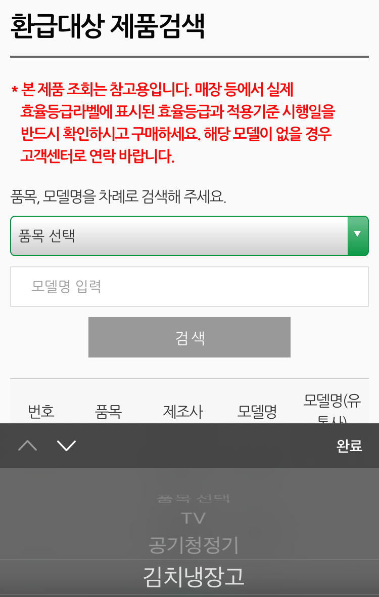 으뜸효율 환급신청 홈페이지 - 환급대상 제품검색