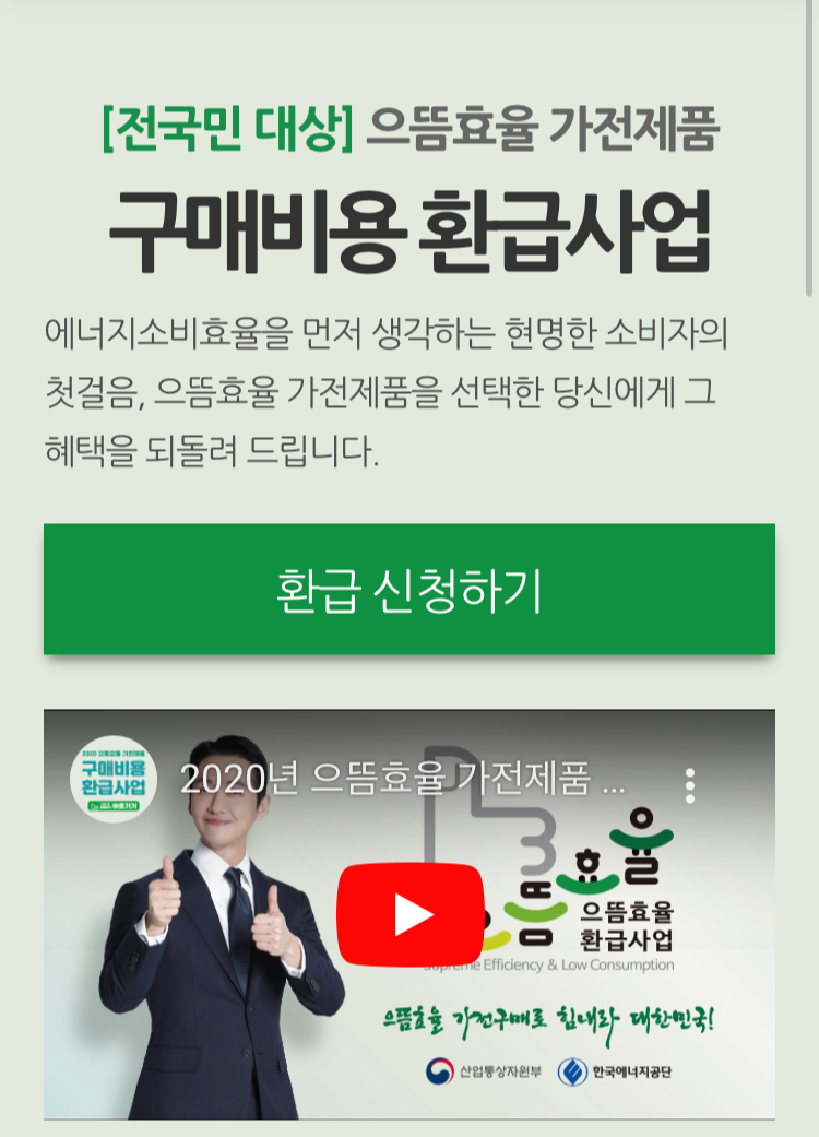 --> [전국민 대상] 으뜸효율 가전제품 구매비용 환급사업 에너지소비효율을 먼저 생각하는 현명한 소비자의 첫걸음, 으뜸효율 가전제품을 선택한 당신에게 그 혜택을 되돌려 드립니다. 환급 신��