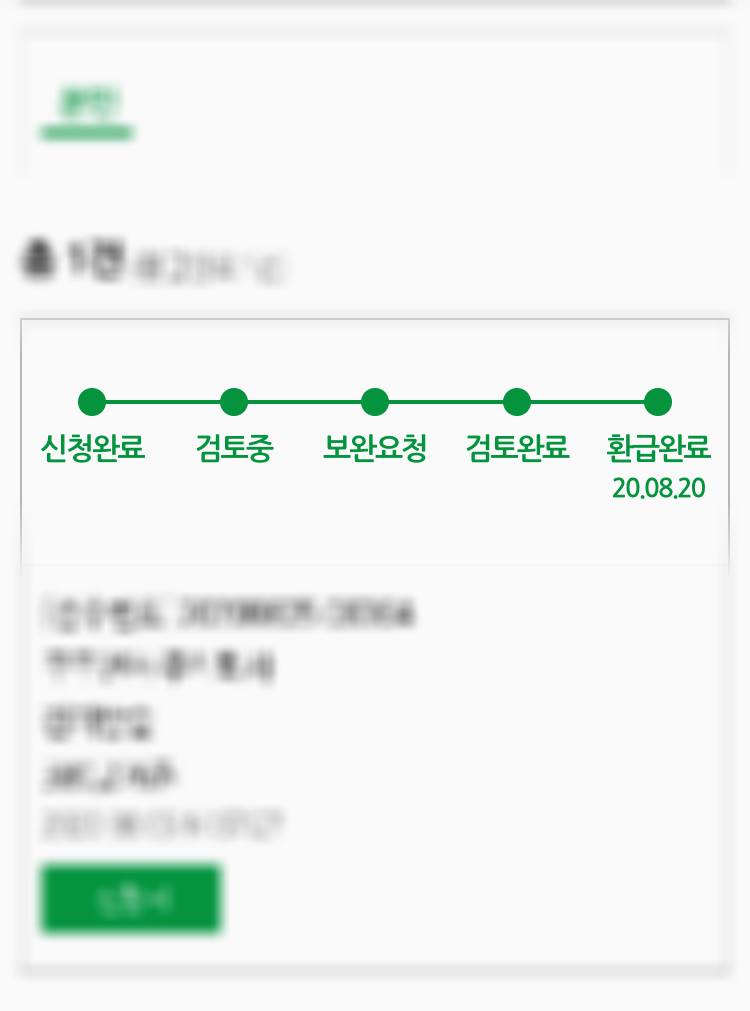 신청시 마무리로 환급금을 수령할 계좌정보까지 입력하시면 신청내역메뉴에서 본인이 신청한 환급신청 진행과정을 확인하실수 있습니다. 저는 8월 5일에 환급금을 신청하였고 환급완료일은 8월 20일로 약 15일의 기간이 쇼요되었습니다. 검토중간에 보완해야할 부분이 있을시 보완요청 알림문자와함께 내용수정을 진행해야하며 이부분은 문자로 수정해야하는 내용을 알려주시때문에 요청이 온대로 진행하시면 됩니다.