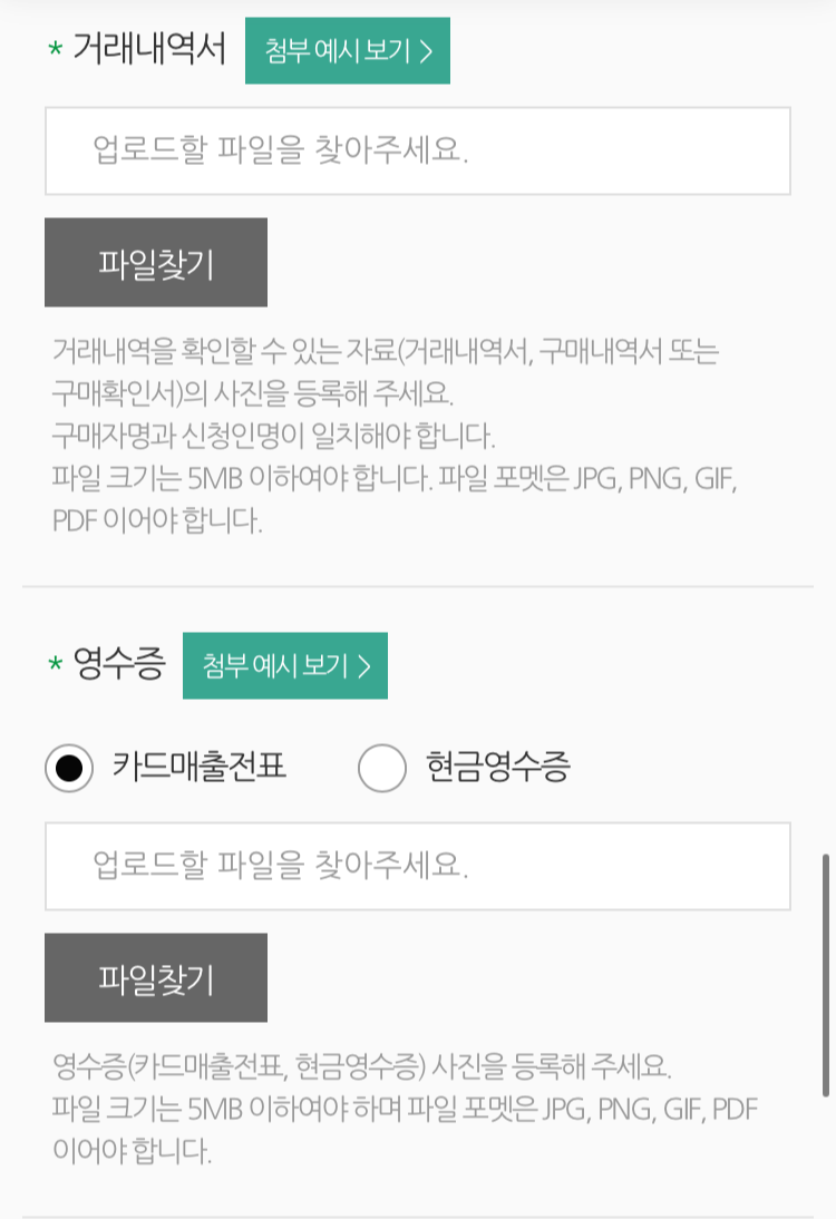 신청시 필요한 준비물 서류는 제품을 수령한후 직접 촬영한 제품라벨사진/제품명판사진/거래내역서/영수증 을 첨부하여야합니다. 온라인에서 구매시 구매한 쇼핑몰의 구매한제품의 구매내역 자세히보기등에 들어가시면 카드매출전표출력,거래명세서출력등을 진행하실수있습니다.