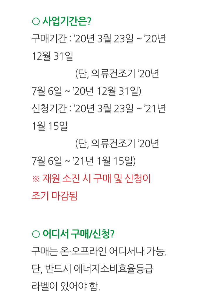다만, 의류건조기는 '20. 7. 6. ~ 12. 31. 사이에 구매한 제품이 대상이 되며, '20. 7. 6. ~ '21. 1. 15. 까지 신청을 해야 합니다.