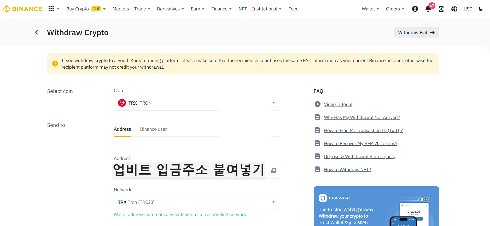 Send to - Address( 주소) 에 업비트계정에서 본인의 트론 입금주소를 복사하신후 복사한 주소를 붙여넣기 하시면됩니다. 네트워크 주소는 TRX20인것을 꼭 확인