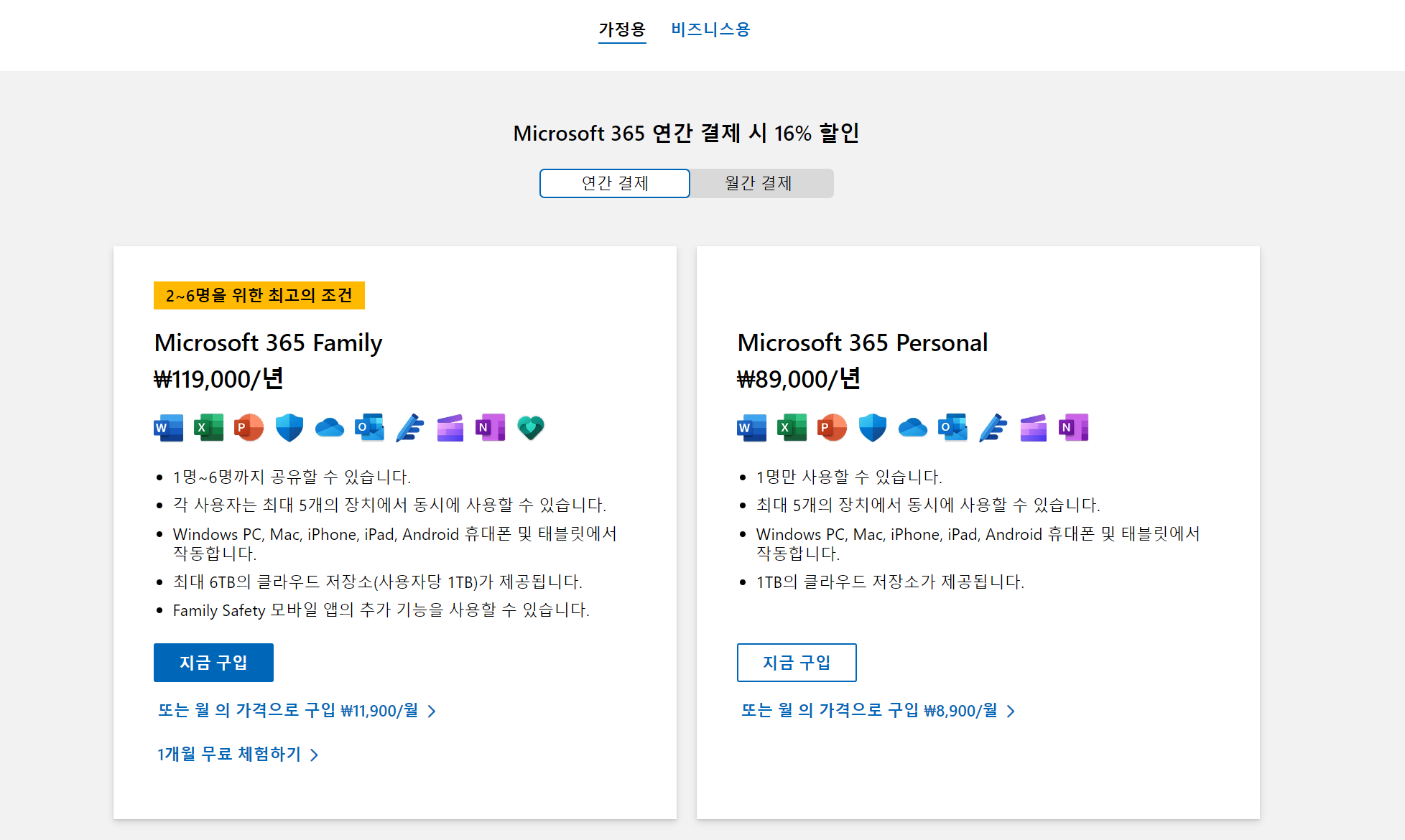 마이크로소프트365는 마이크로소프트에서 지원하는 모든기능을 이용할수있으며 클라우드서비스도 한계정당 1TB 로 넉넉하게 지원하기에 가격에 대한 부담만 없다면 추후 지원되는 업데이트등도 생각했을때 크게 신경쓸부분없이 누릴수 있지요 다만 단점은 역시 매달 혹은 매년 들어가는 고정비용정도?